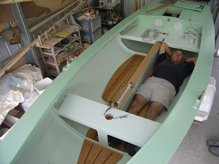 Good ergonomics for camping aboard. The nice floorboards and the gentle curve of the planking make for a secure sleeping position with easy access to the stowage under the aft seating.The centreboard case makes for a sense of privacy from someone on the other side! I'm just an inch short of six feet tall, and you can see there is still length available at my feet.