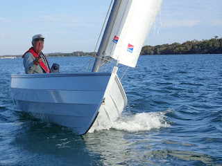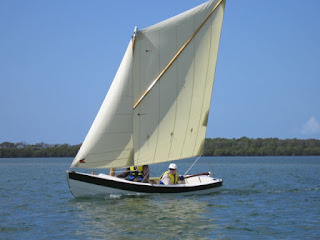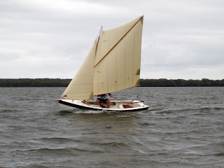 Just the mizzen set in the middle position. John is sitting comfortably inside the boat in a relaxed manner. Believe it or not, he was actually overtaking the boat in the background. This is a good lesson in physics. Once the wind gets to a certain speed, a boat will often be capable of higher speeds if the sail area is reduced! Read "High Performance Sailing" by Frank Bethwaite for the science.